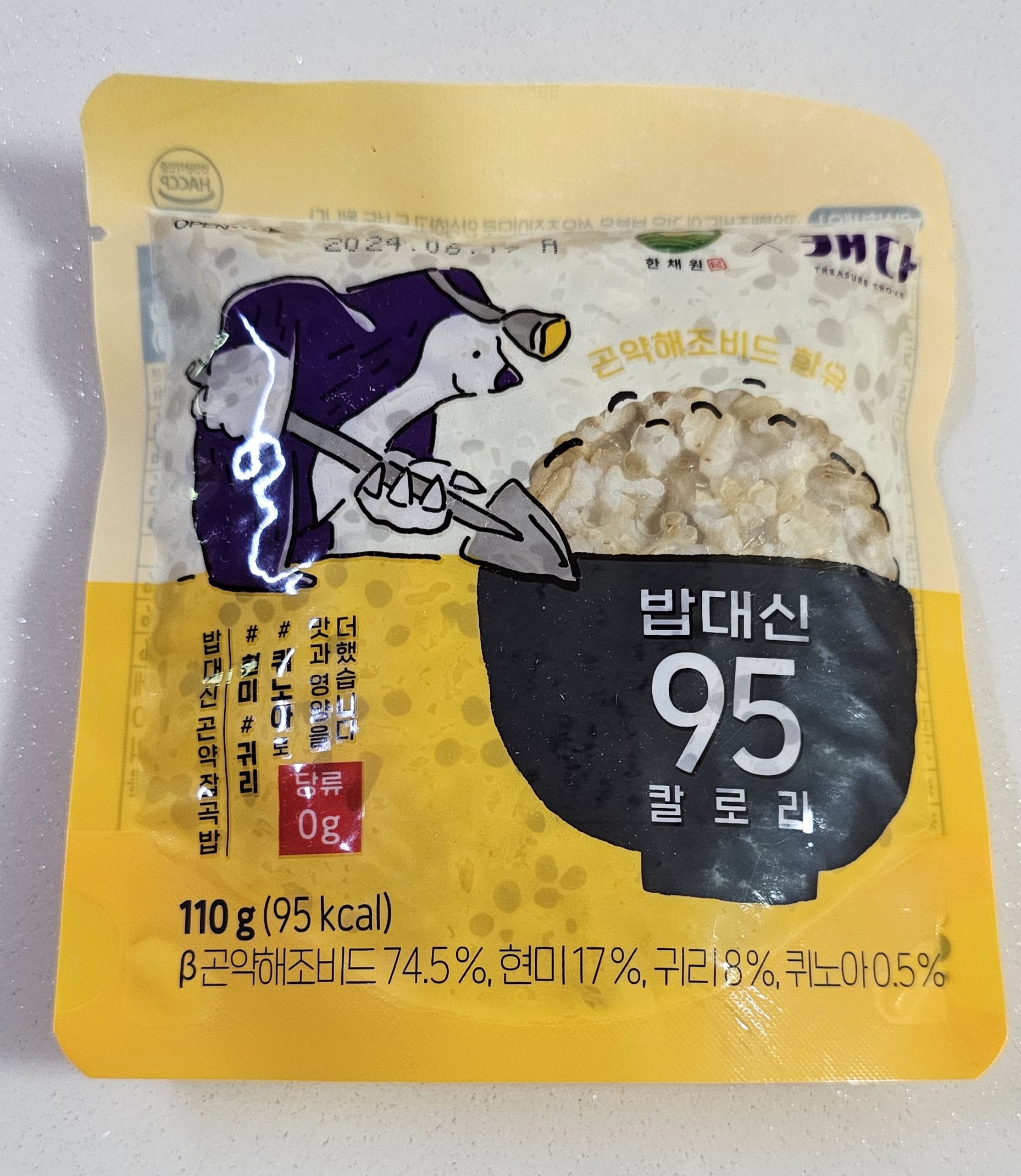 얼마전에 온라인 쇼핑몰에서 구입한 귀리현미밥이다. 퀴노아도 들어갔다고 하는데 아주 작은 손바닥 만한 분량이며 칼로리는 95kcal라고 한다.