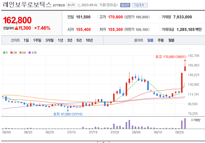 레인보우로보틱스가 8월 31일 목요일 상한가를 기록했으며 현재 162,800원에 마감했다. ( 시총 3조 1,341억원)