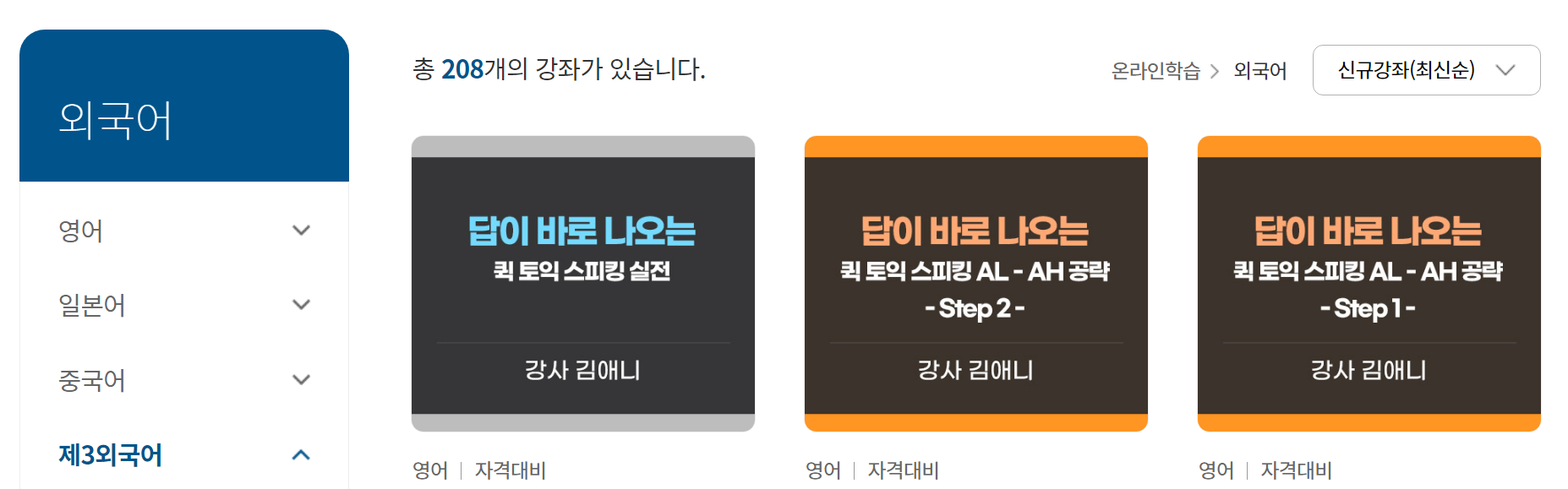 3. 온라인학습 > 외국어를 클릭하면 다음과 같이 총 208개의 외국어 무료 강의가 검색된다.