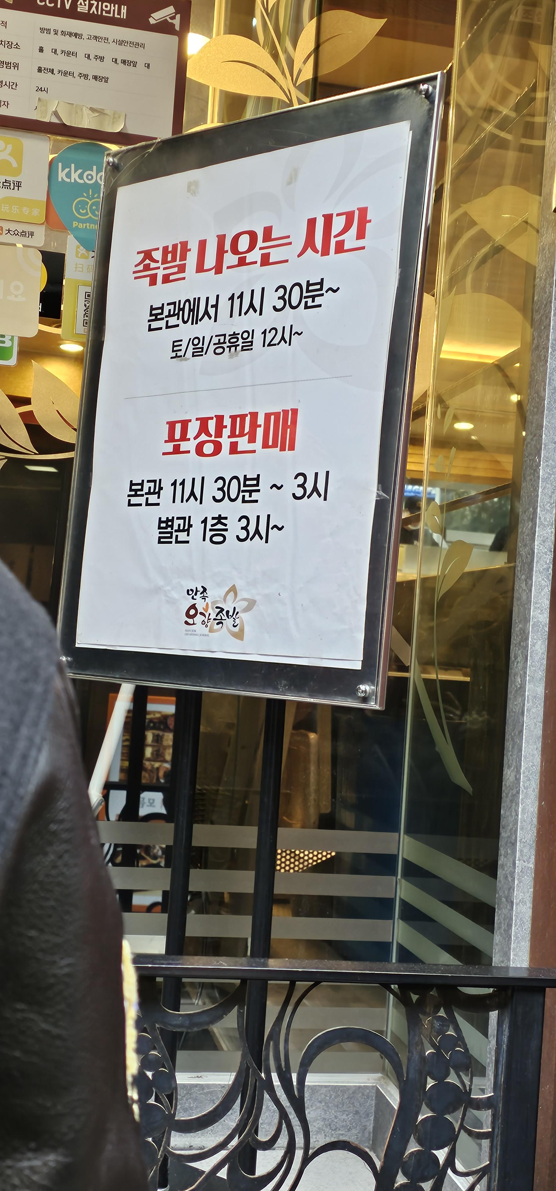 오픈 시간 30분 전부터 꽤 많은 사람들이 오향족발집의 문앞에 진을 치고 있다. 오픈 시간이 점점 가까워지자 여기저기 흩어져있던 사람들이 줄을 한줄로 서서 문앞에서 대기를 한다. 오픈 시간이 되자, 정각에 문이 열리고, 종업원분께서 신속하게 자리로 안내를 한다.