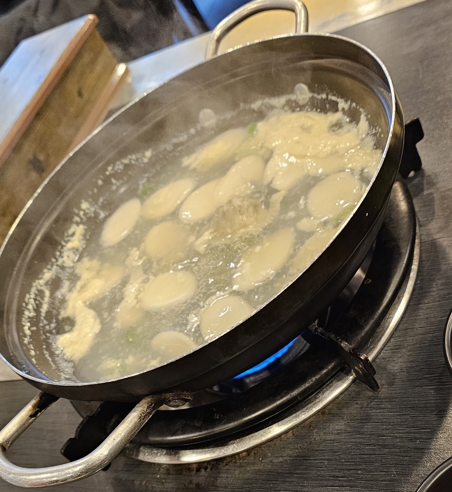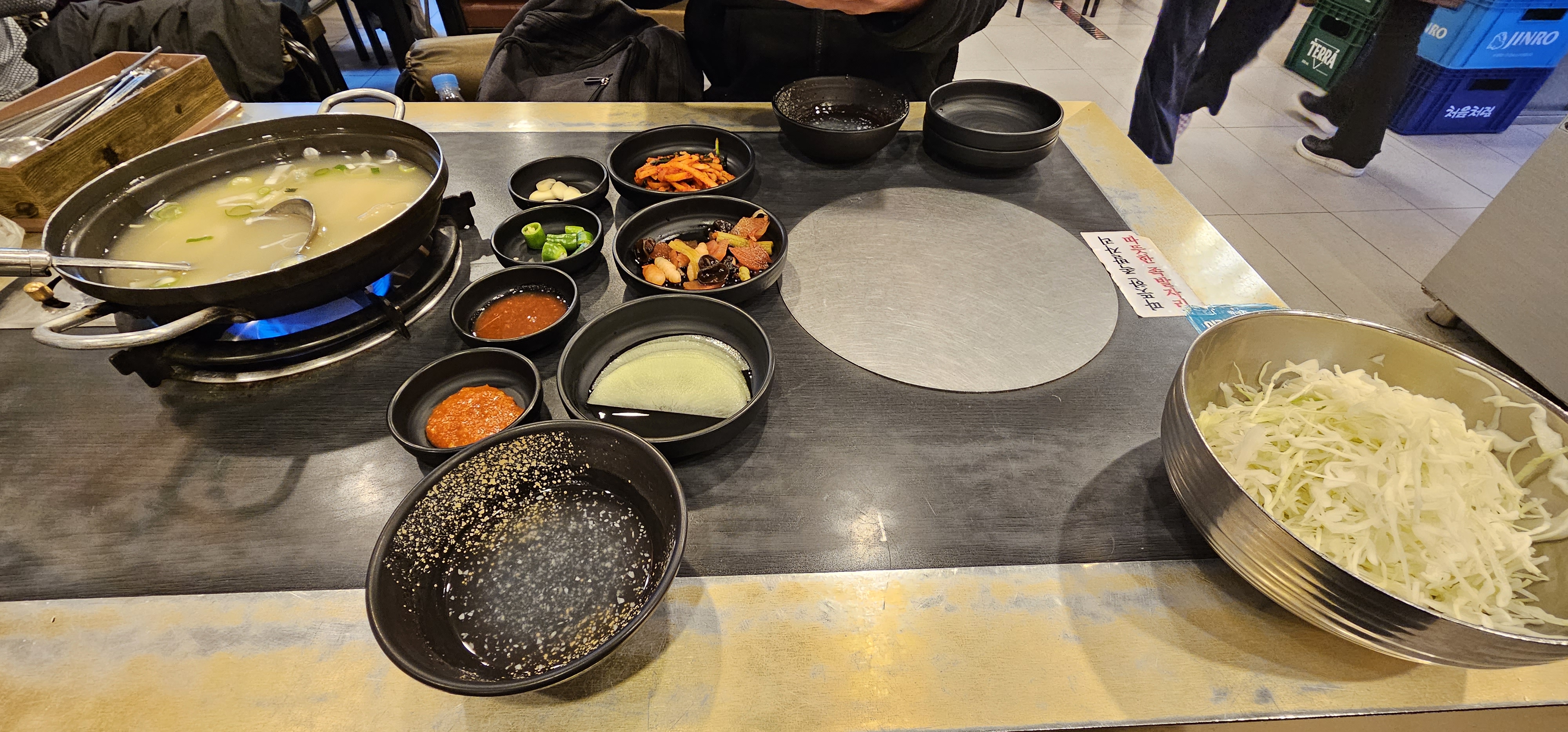 우리 일행은 식당에 들어가자 마다 2인용 좌석으로 안내를 받았고, 곧이어서 기본 반찬들과 따뜻한 떡국이 차려졌다.
