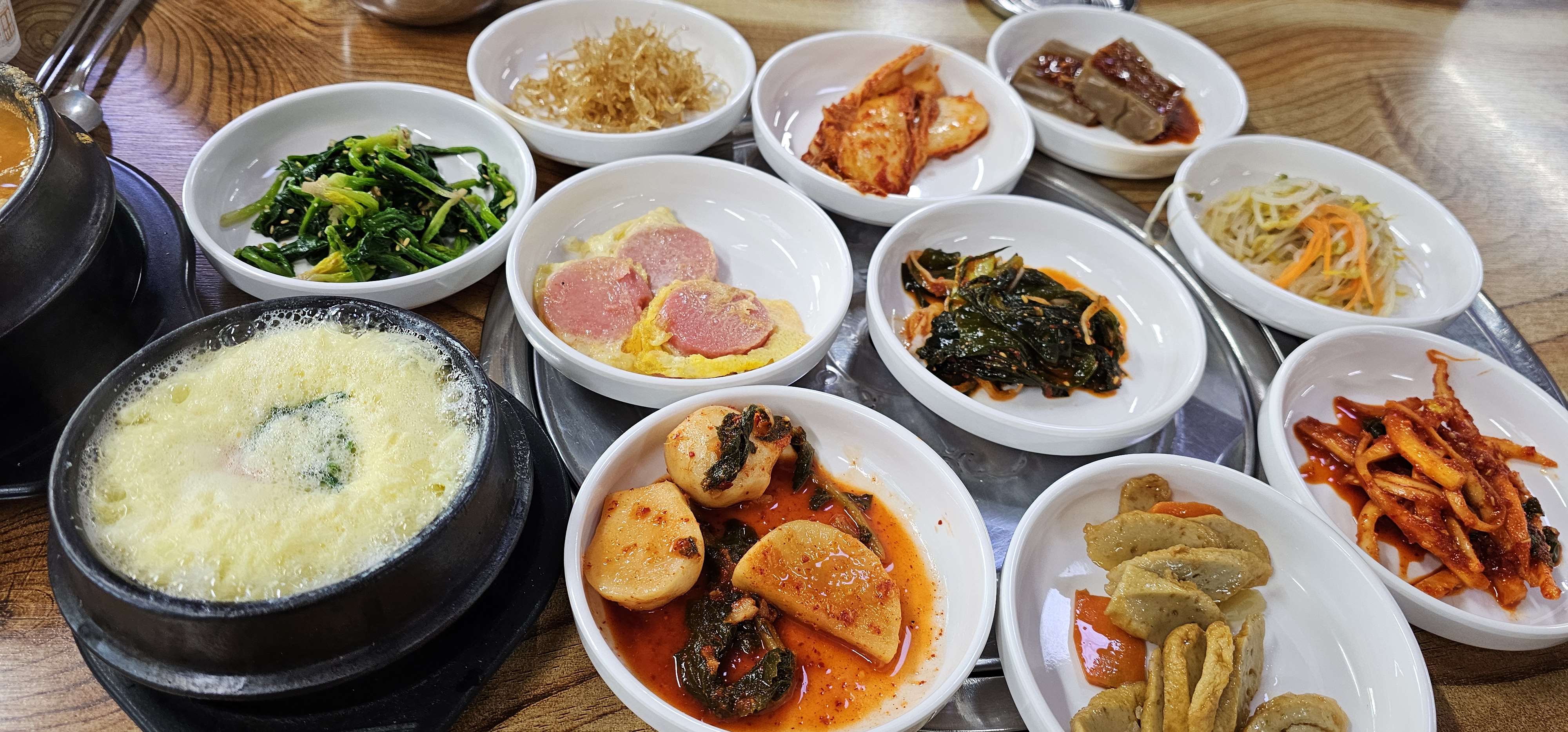 우리 부부는 비지찌게를 주문했고, 몇 분의 시간이 흐르자 집밥 스타일의 찬이 테이블에 쫘악 서브되었다.