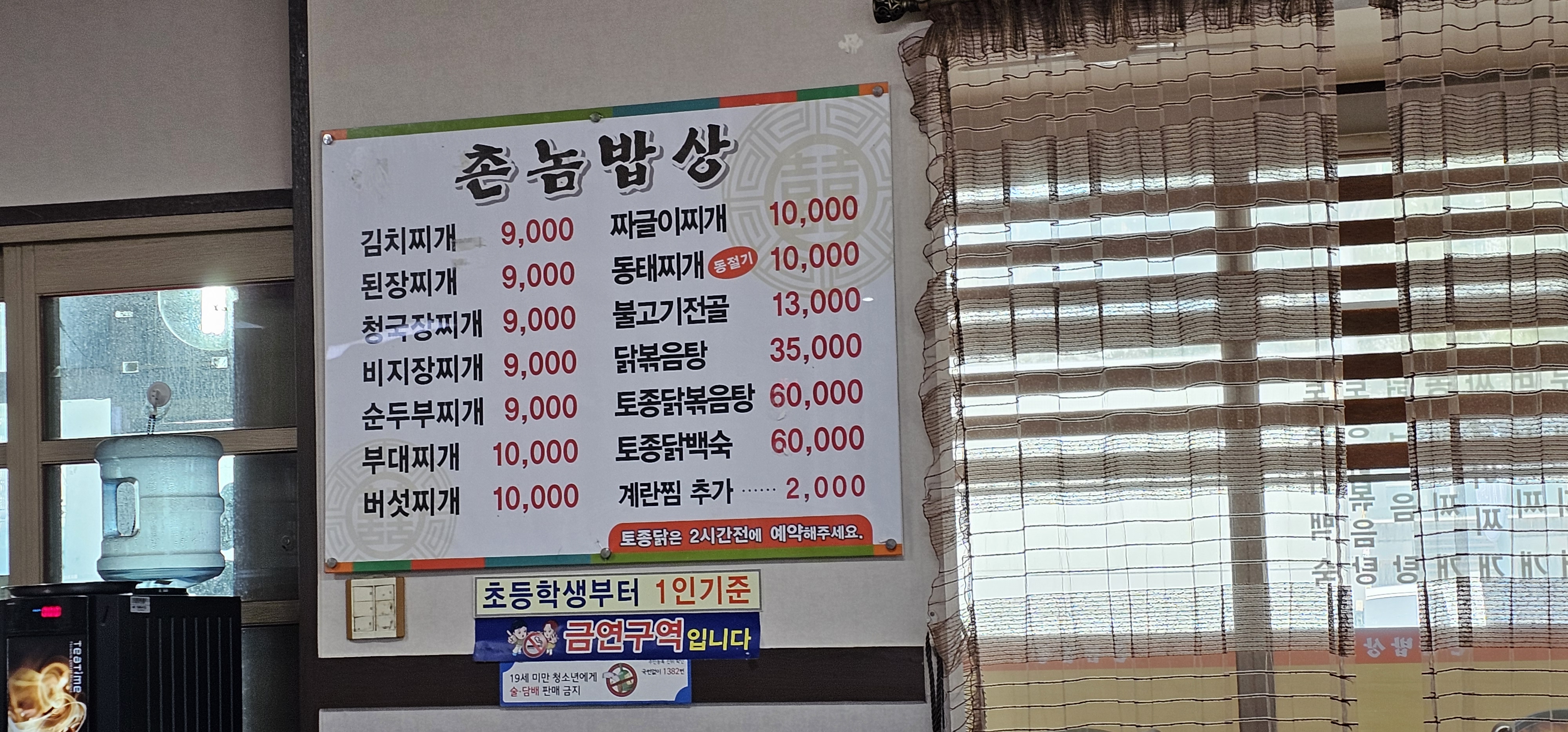 이곳은 집밥 스타일의 반찬이 맛있다고 꽤 소문이난 곳이라 한다. 메뉴표를 보니 9,000원의 가격에 김치찌게, 된장찌게, 청국장찌게, 비지찌게, 순두부찌게등을 먹을 수 있고, 버섯이나 부대찌게는 10,000원에 먹을수 있다. 짜글이, 동태찌게등 선택의 폭이 넓으며 토종닭백숙이나 볶음탕의 메뉴도 있다.