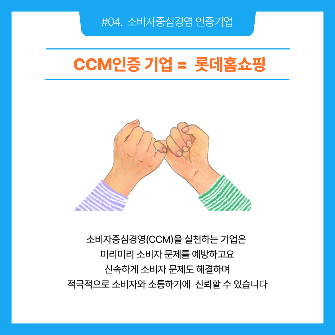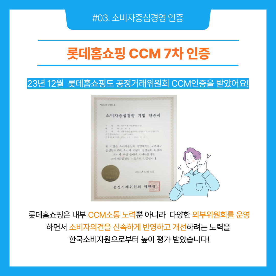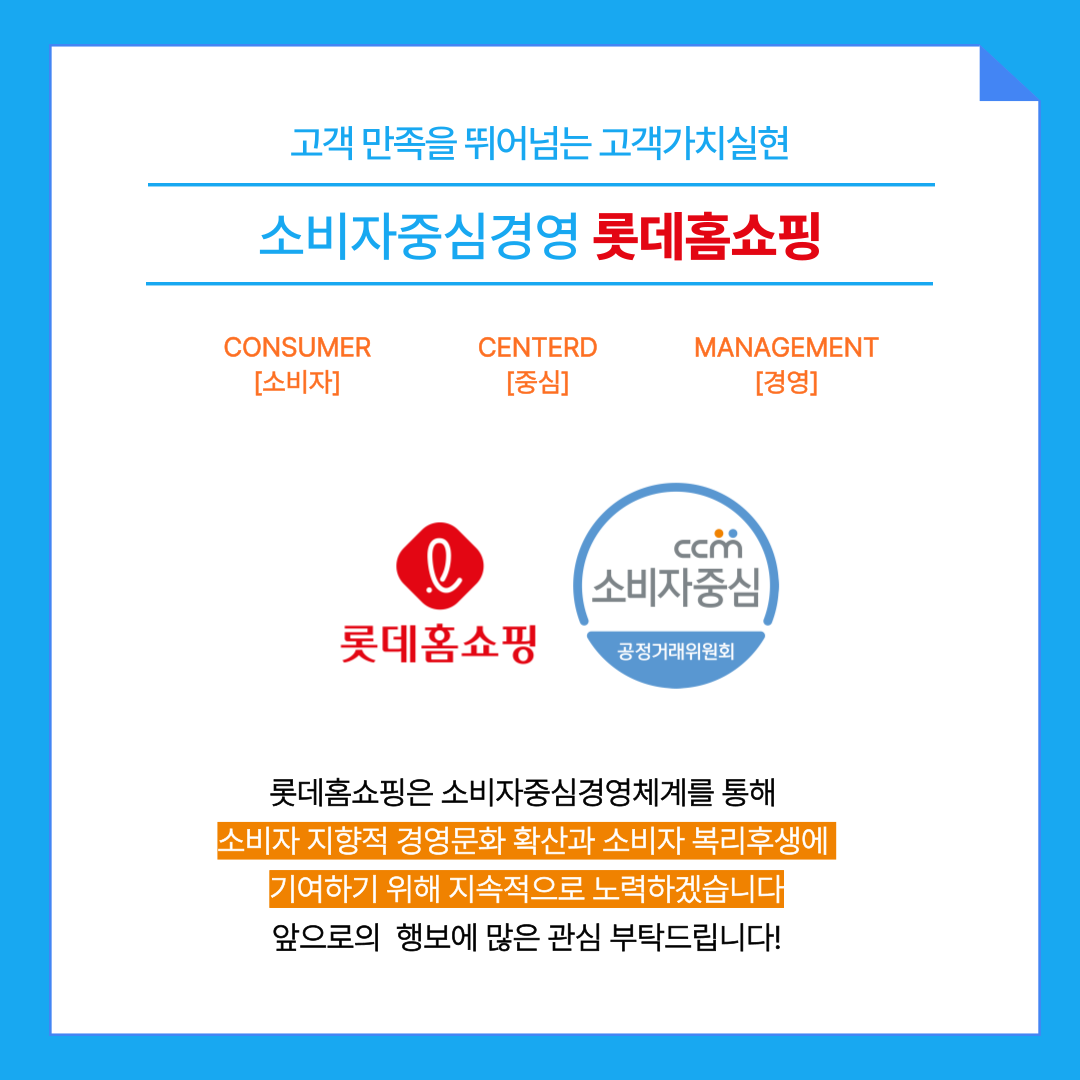 즉, 기업의 영리만을 최우선으로 하는 기업이 아닌 소비자를 위한, 소비자와 함께 하는 소비자 친화적인 기업으로서 롯데홈쇼핑이 공식적으로 인증을 받았다는 것인데요, 많은 기업들이 받고 싶어하는 CCM인증은 공정거래위원회에서 인증을 해준다고 합니다.