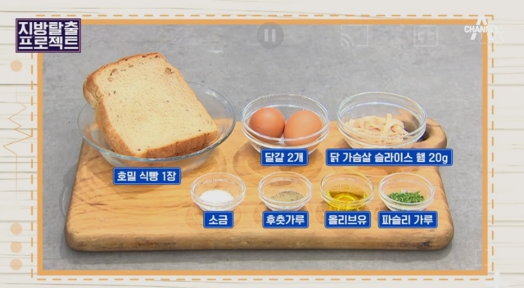 레서피와 재료는 복잡하지 않고 간단하다. 호밀 100%로 된 식빵 1장, 달걀 2개, 닭 가슴살 슬라이스햄 20g, 소금, 후춧가루, 올리브유, 파슬리가루를 준비한다.