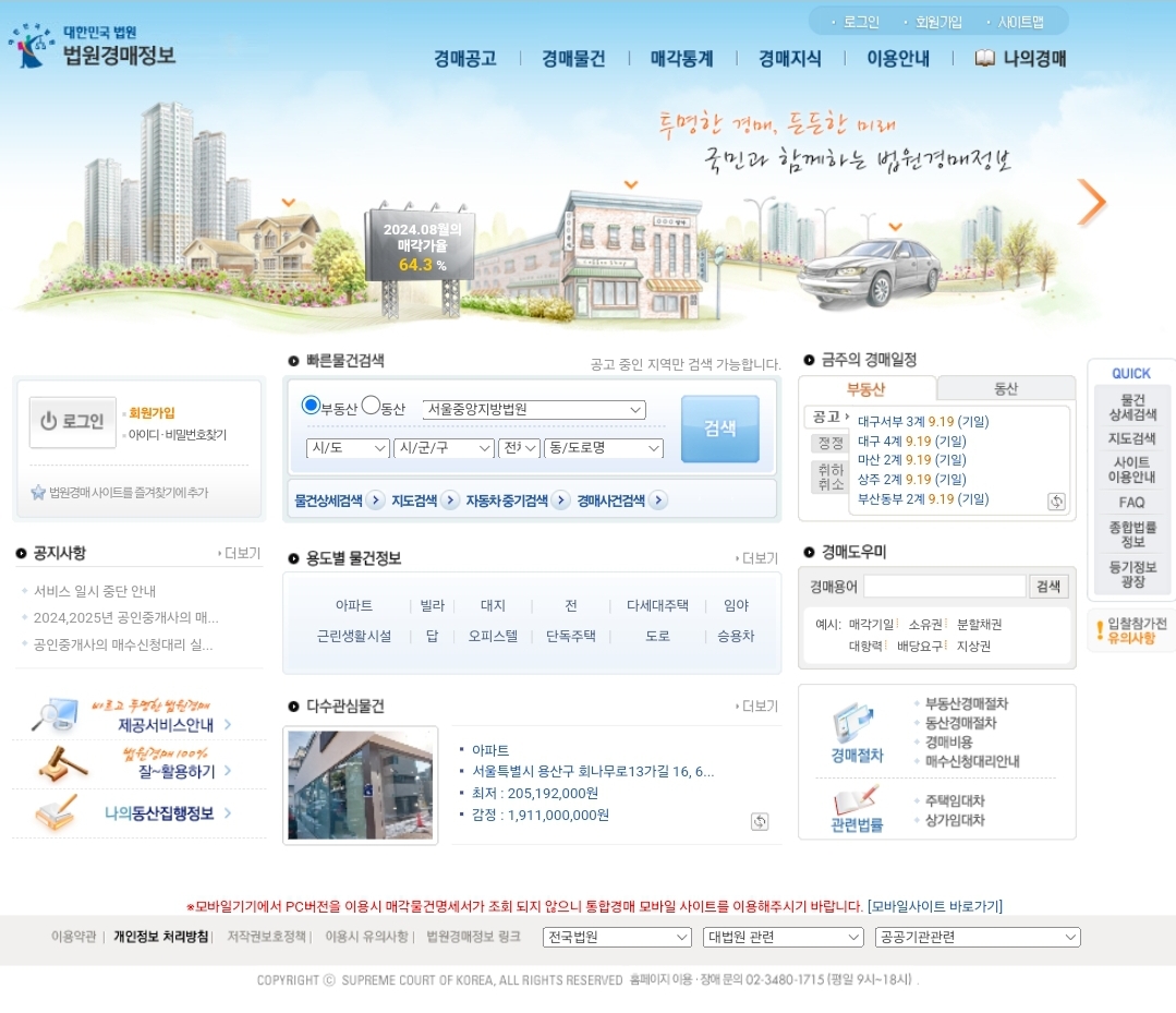 모든 경매는 대법원의 법원경매정보를 통해서 검색이 가능하며 경매물건의 매각공고, 경매절차, 경매에 필요한 서식과 용어, 법률 정보등을 열람할 수 있다.