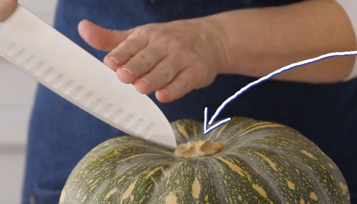 단호박을 통째로 자를때에는 꼭지의 바로 옆 부분의 파인 부분을 시작점으로 해서 칼끝을 넣어서 자른다. 비교적 예리하고 날이 잘 드는 칼로 잘라야하며 ( 껍질이 꽤 단단하다. ) 초보자들에게는 쉽지않은 작업일 수 있다. 특히 껍질이 많이 딱딱하기때문에 손을 다치지 않도록 주의를 한다.