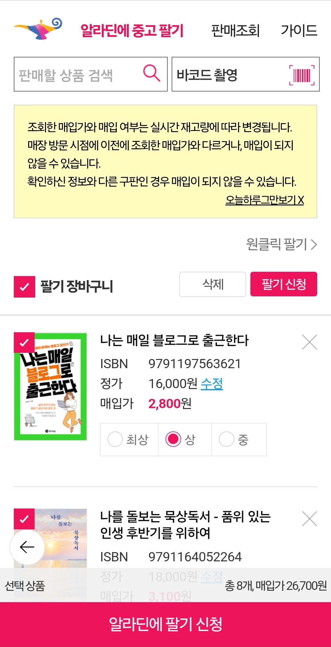 알라딘 중고 서점에 책을 팔기 위해서는 일단 책의 상태가 좋아야한다.