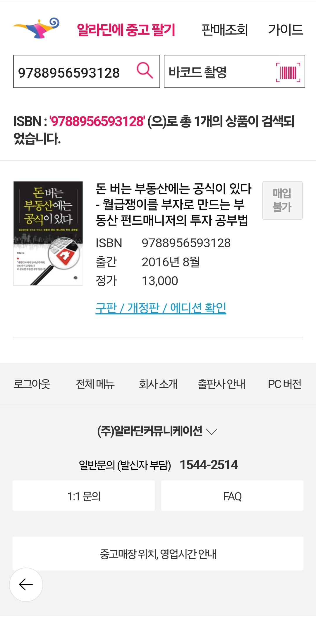 이곳을 접속해서 들어가면 책의 이름이나 바코드 검색만으로 알라딘에서 매입가능한 책인지 여부를 바로 확인 할 수 있다.