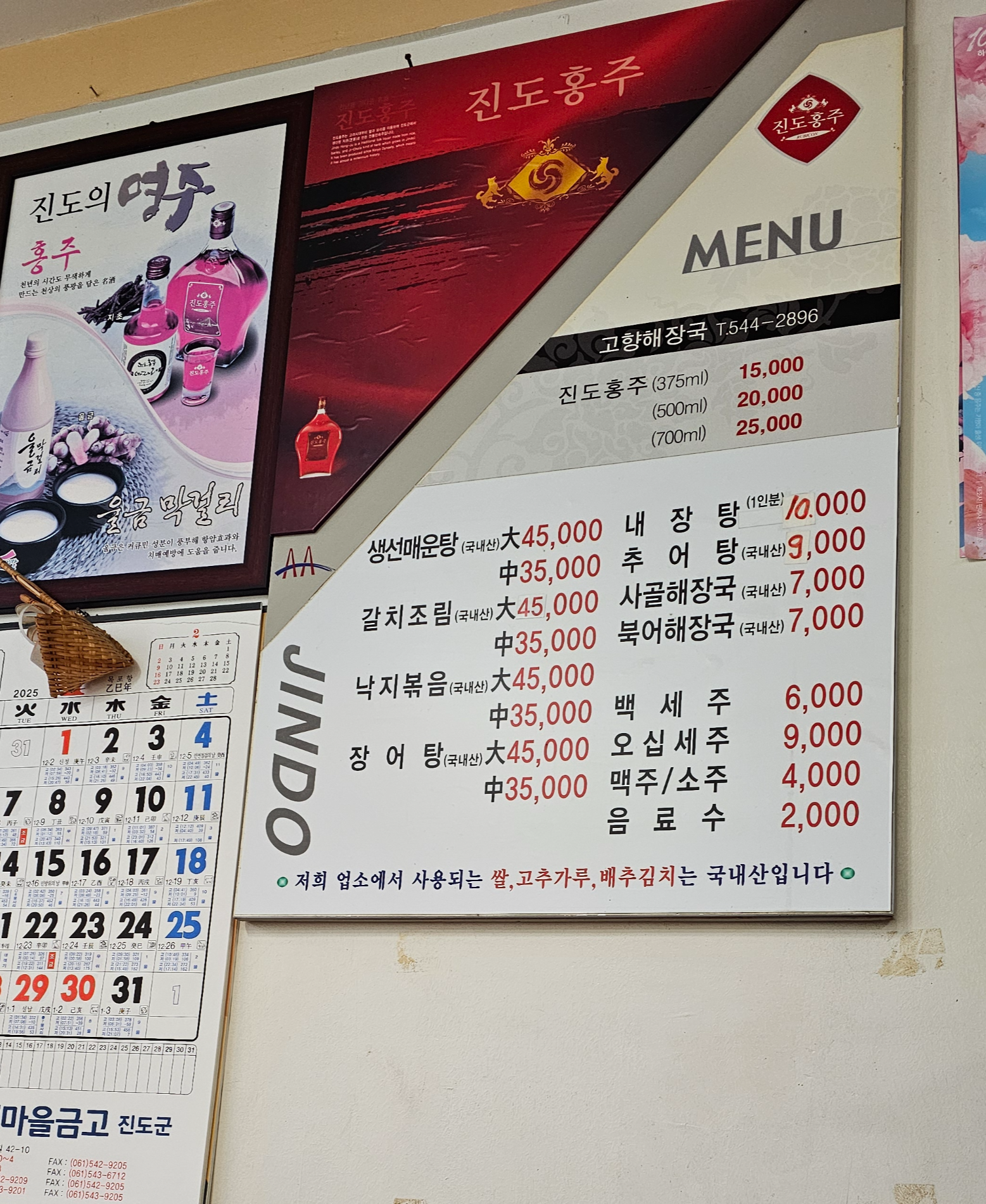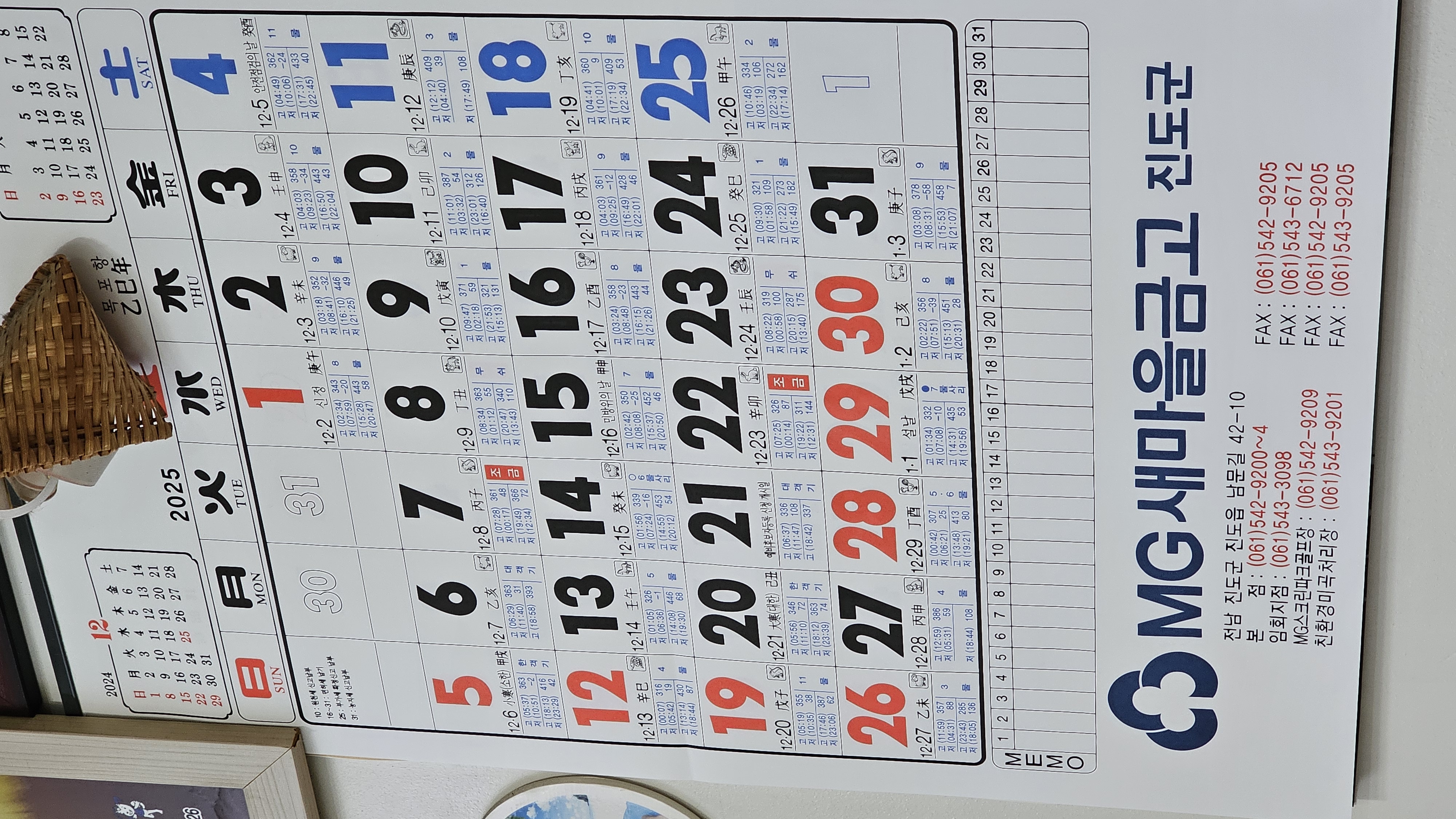 고향해장국 식당의 벽쪽에는 진도군 새마을금고에서 발행한 글씨큰 달력이 걸려있었다. 날짜밑에 뭔가 작은 글씨가 빼곡하게 채워져있길래 자세히보니 바닷물이 최고 높은 시간대와 가장 낮은 시간대가 적혀있다. 어업을 생업으로 하는 사람들이 많은 진도군이다보니 달력에서도 지역 특색이 뭍어났다.