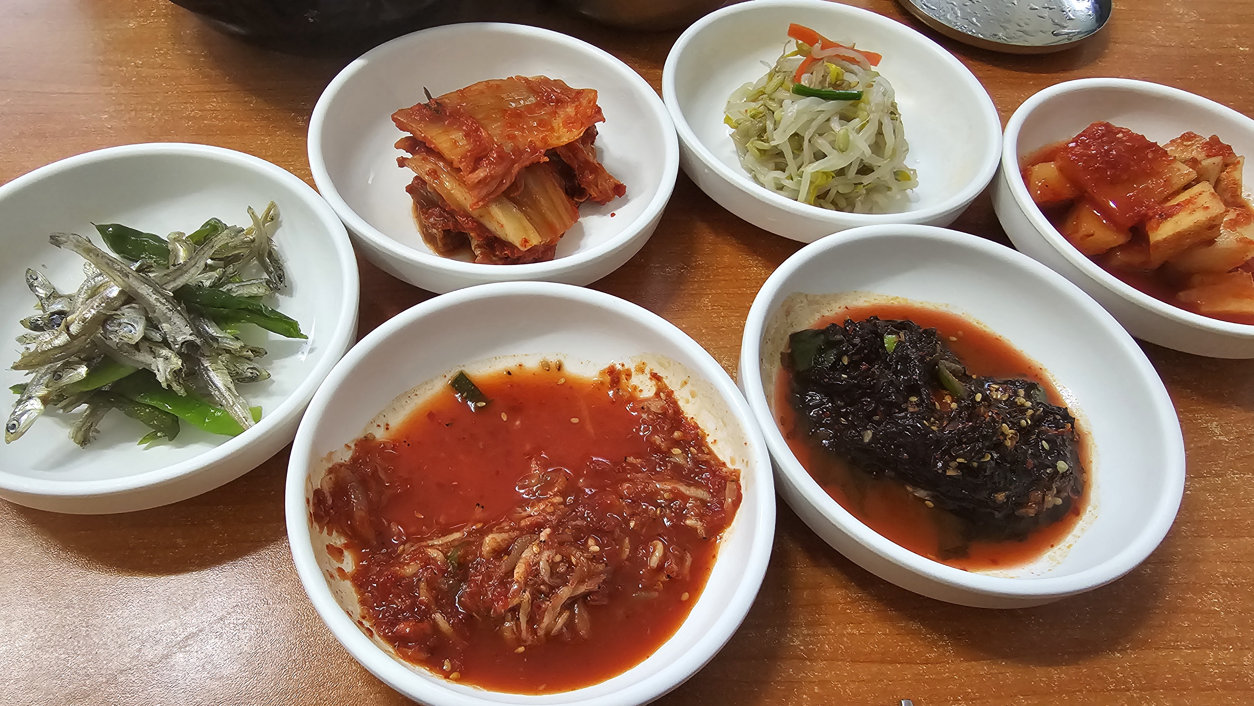 주문한지 얼마안되서 주인 할머니께서 몇 가지 반찬을 내오셨다. 빨간색 새우젓갈은 해장국의 간을 맞추는 것이라 하시면서 놓아주셨고, 멸치, 파래무침, 김치, 콩나물, 깍두기등의 찬이 나왔다.
