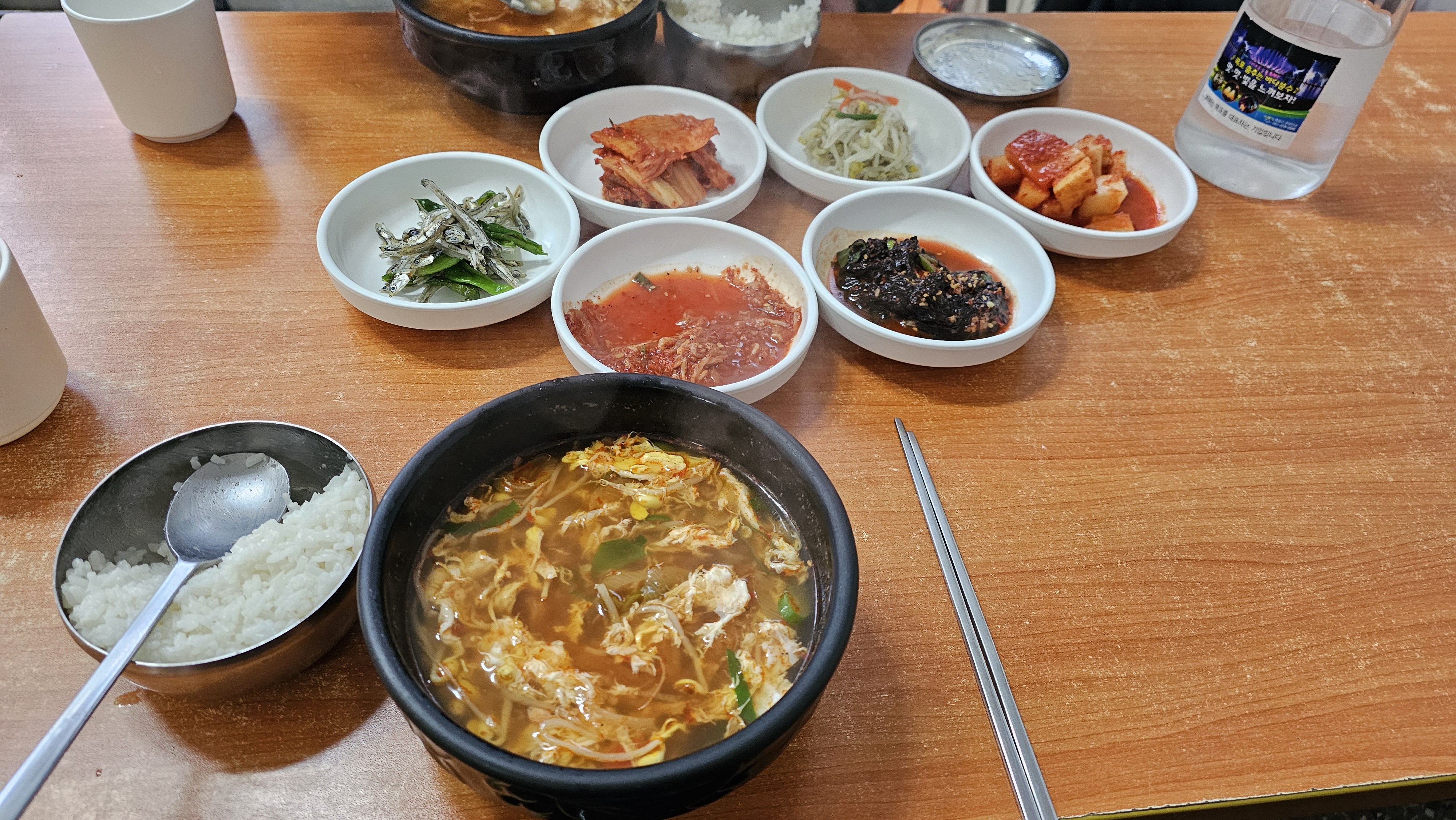 그리고 곧이어 북어해장국이 나왔다. 맛을 보니 기대 이상이다. 가격도 7,000원이어서 큰 기대는 하지 않았는데 국물이 깔끔하면서도 시원했다. 기교없이 뚝딱 만들어낸듯한 비쥬얼의 반찬들도 해장국과 잘 어울렸다.