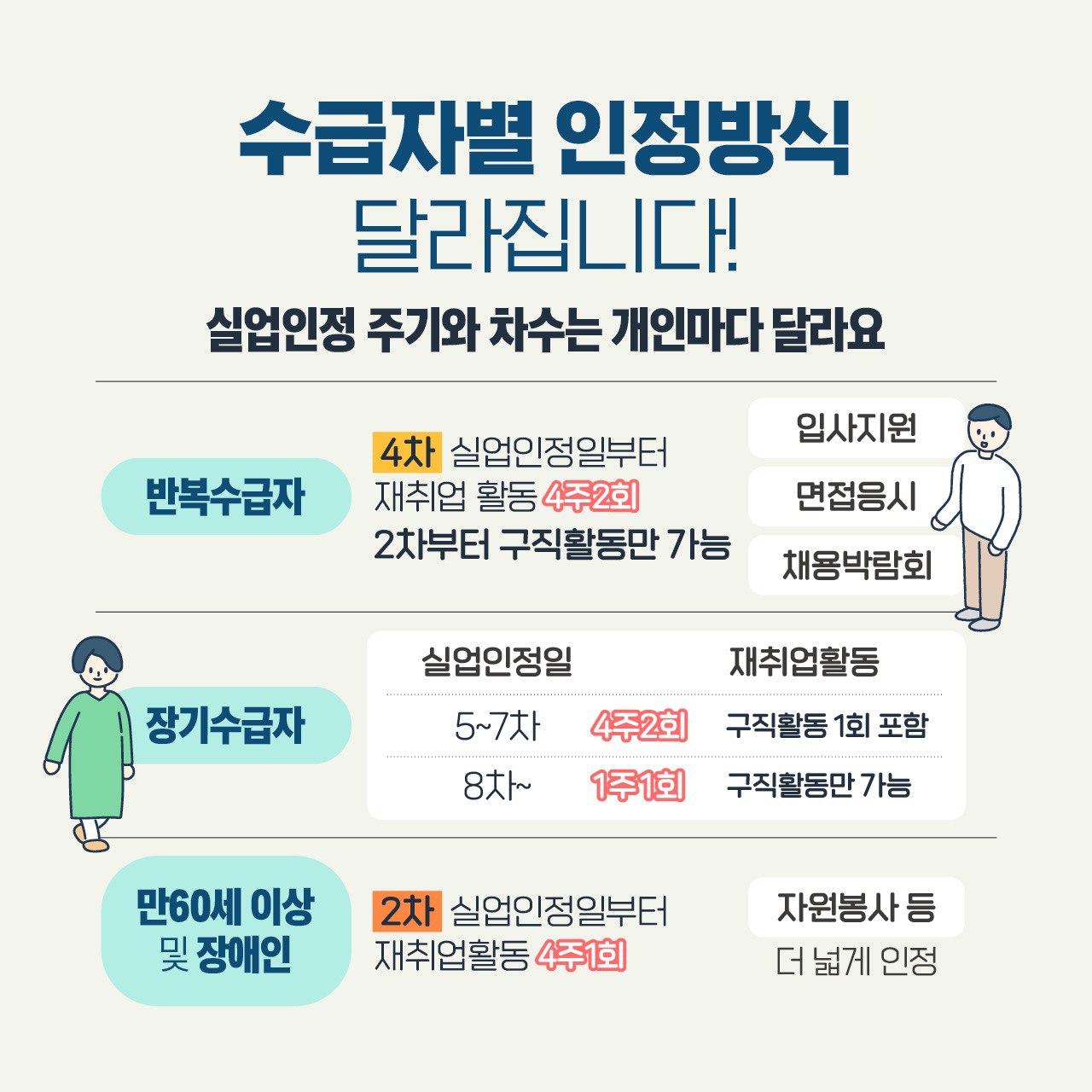 이번 변경 내용의 골자는 1. 수급자들의 특성에 맞게 기준을 달리하여 차별화하여 적용을 하고 2. 수급자들의 재취업 및 맞춤형 취업활동에 대한 지원 강화 2. 허위수급자, 장기수급자, 형식적인 구직활동을 하는 신청자들의 모니터링을 강화하는 쪽으로 변경되었습니다.