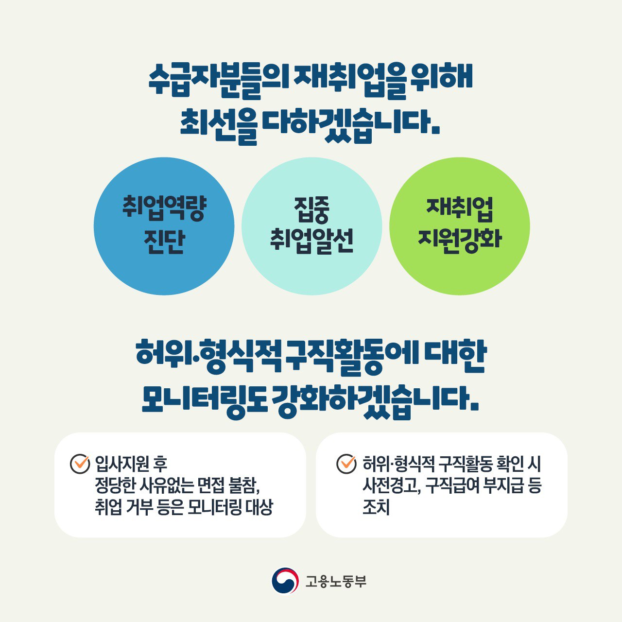 이번 실업급여자격 기준의 변경된 제도에서는 형식적이거나 허위로 구직활동을 하는 수급자들에 대한 모니터링이 대폭 강화되었습니다.