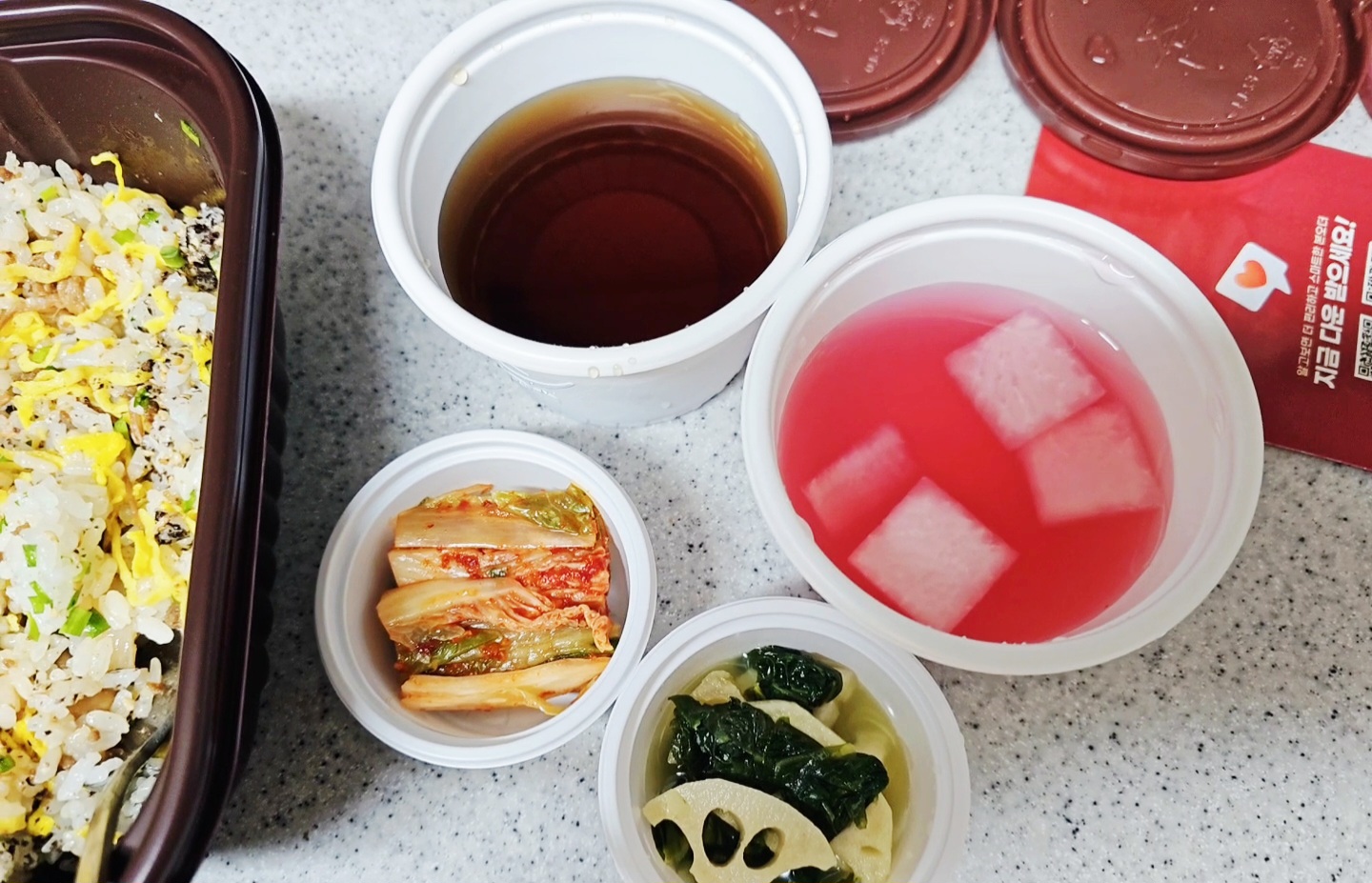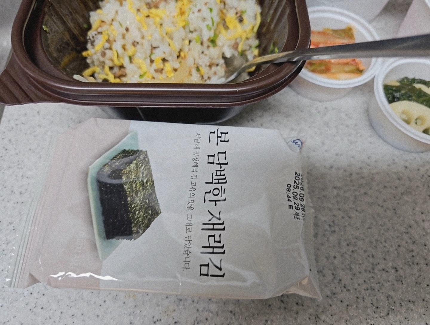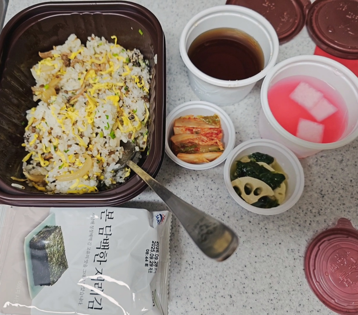 재래김 한 1개, 매실주스, 김치, 연금조림,