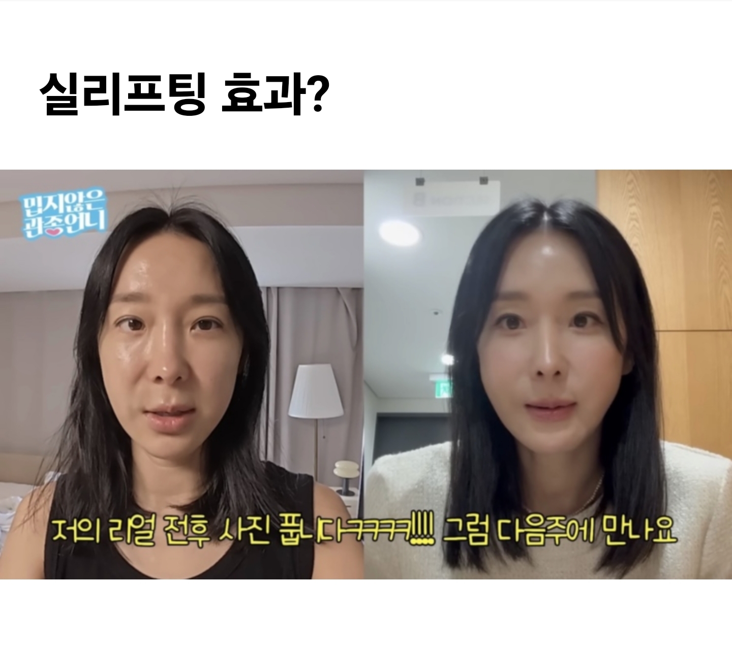 요즘 그녀의 유튜브 콘덴츠 중에서 핫한 '실리프팅 시술' 에 대해서 그녀는 쿨한 성격답게 시술 과정을 솔직하게 공개했다.