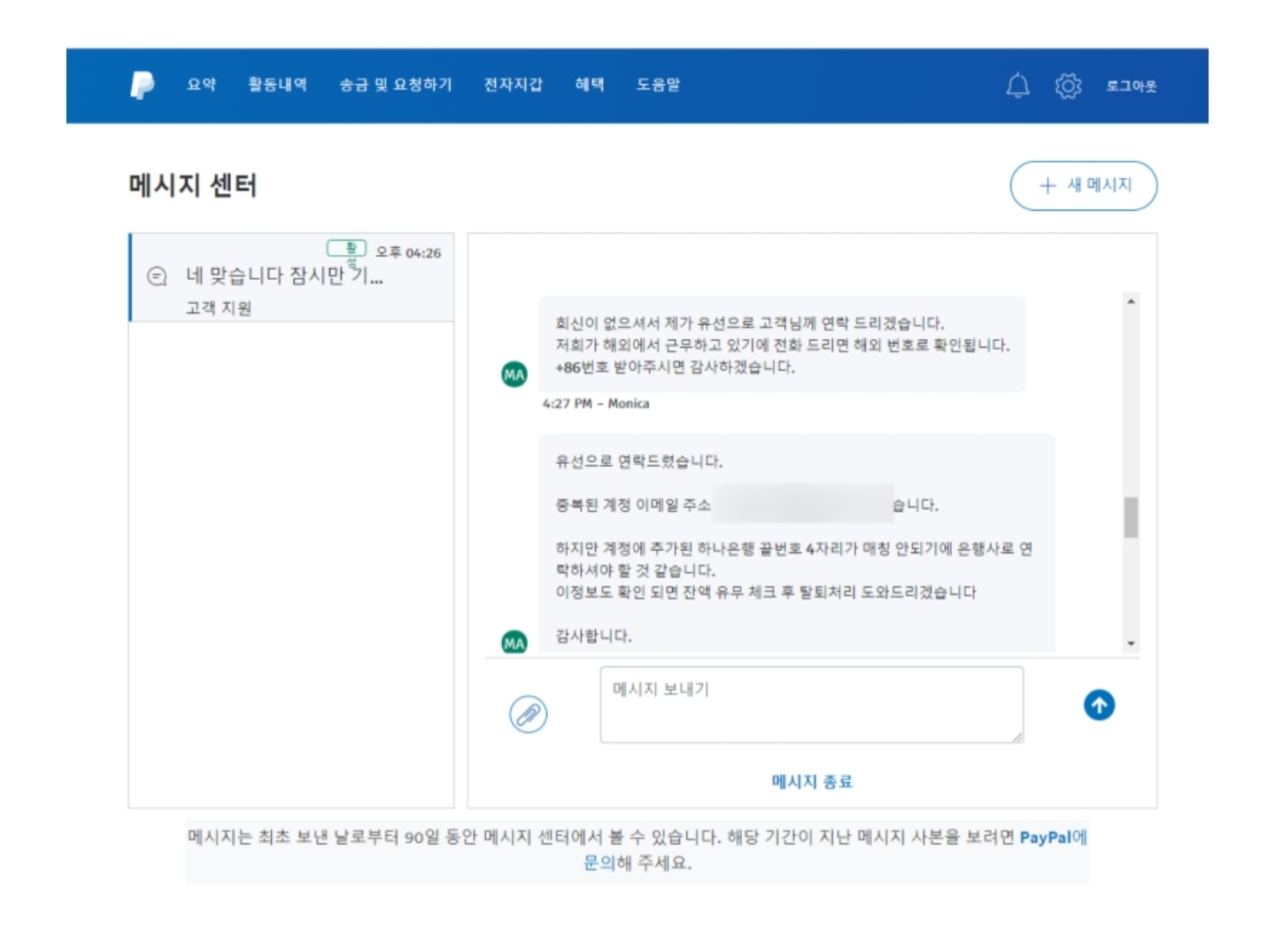 그런데 5월 5일 공휴일임에도 불구하고 잠시후, 페이팔의 고객센터에서 연락이 왔습니다.