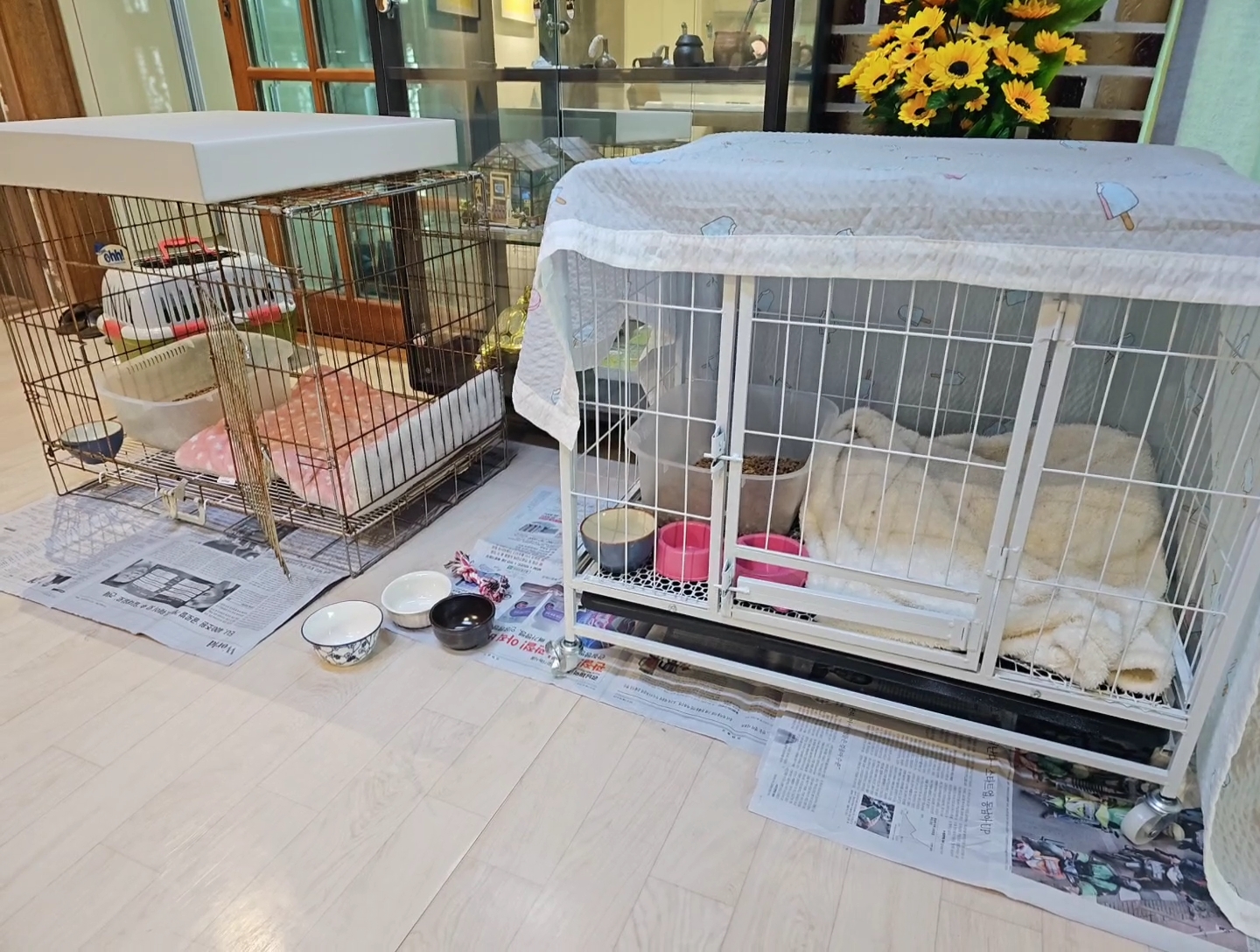 철제케이지안에 푹신한 방석을 깔아놓고, 작은 화장실통에는 펠릿이나 고양이 모래를 깔아서 준비해놓는다.