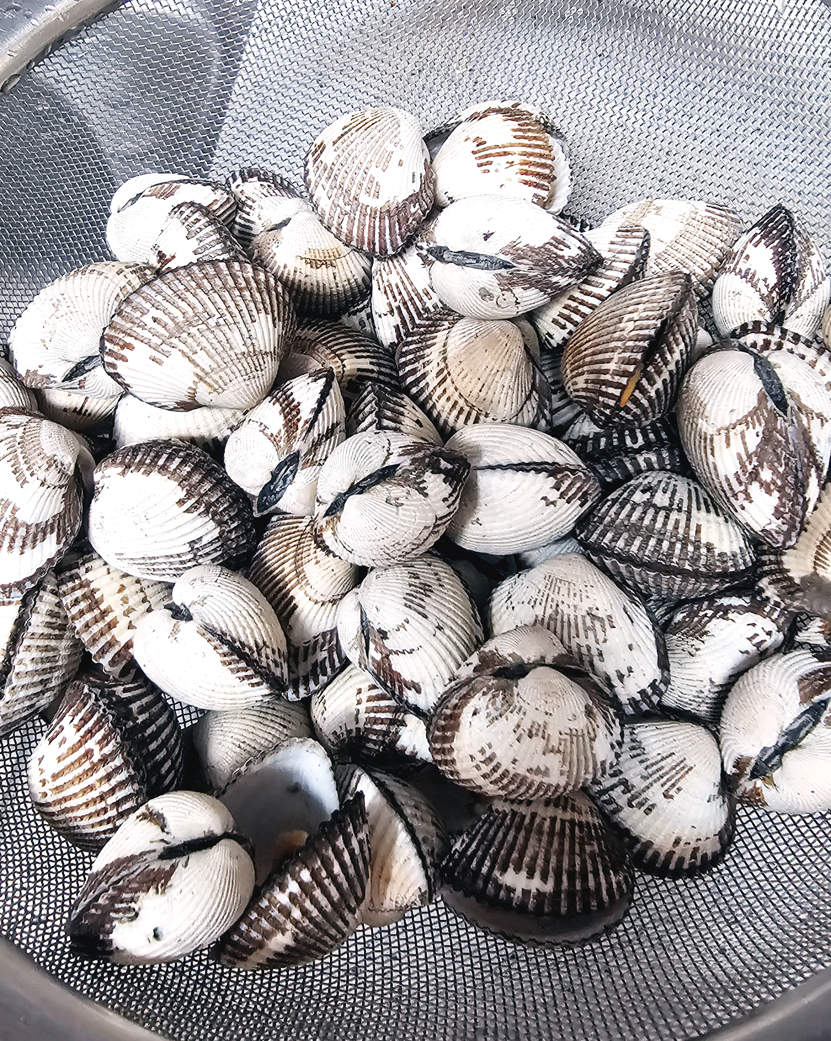 해감 후엔 흐르는 물에 여러 번 헹구어낸다. ( 껍데기 사이에 낀 모래가 빠질때까지 )