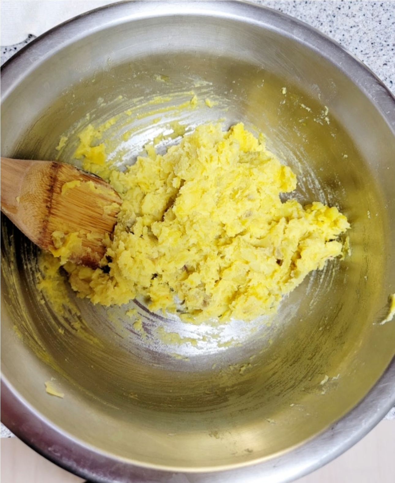 잘 삶아진 고구마는 넓은 그릇에 넣고 주걱등으로 으깨줍니다.