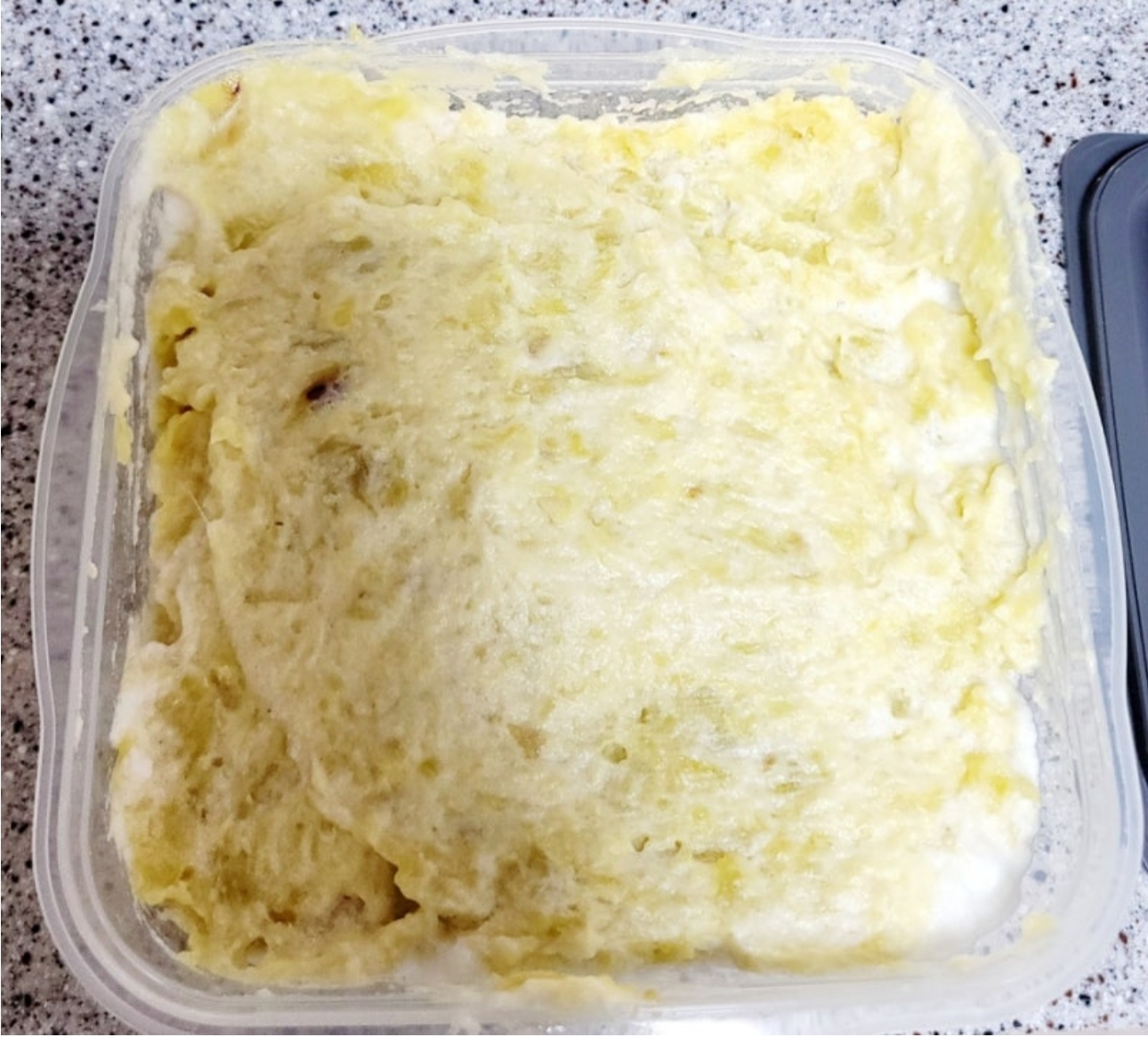 고구마 으깬 것과 머랭을 섞은 반죽을 전자렌지용 용기나 유리 용기에 담고,