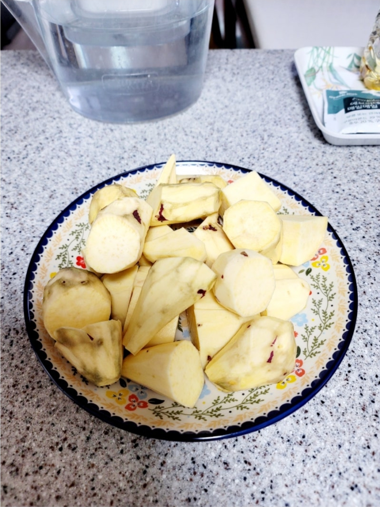 고구마는 깨끗히 씻어서 이렇게 조각을 내줍니다. 조각을 내지 않고 쪄도 되지만, 이렇게 작게 조각을 내주어야 빨리 익어요.