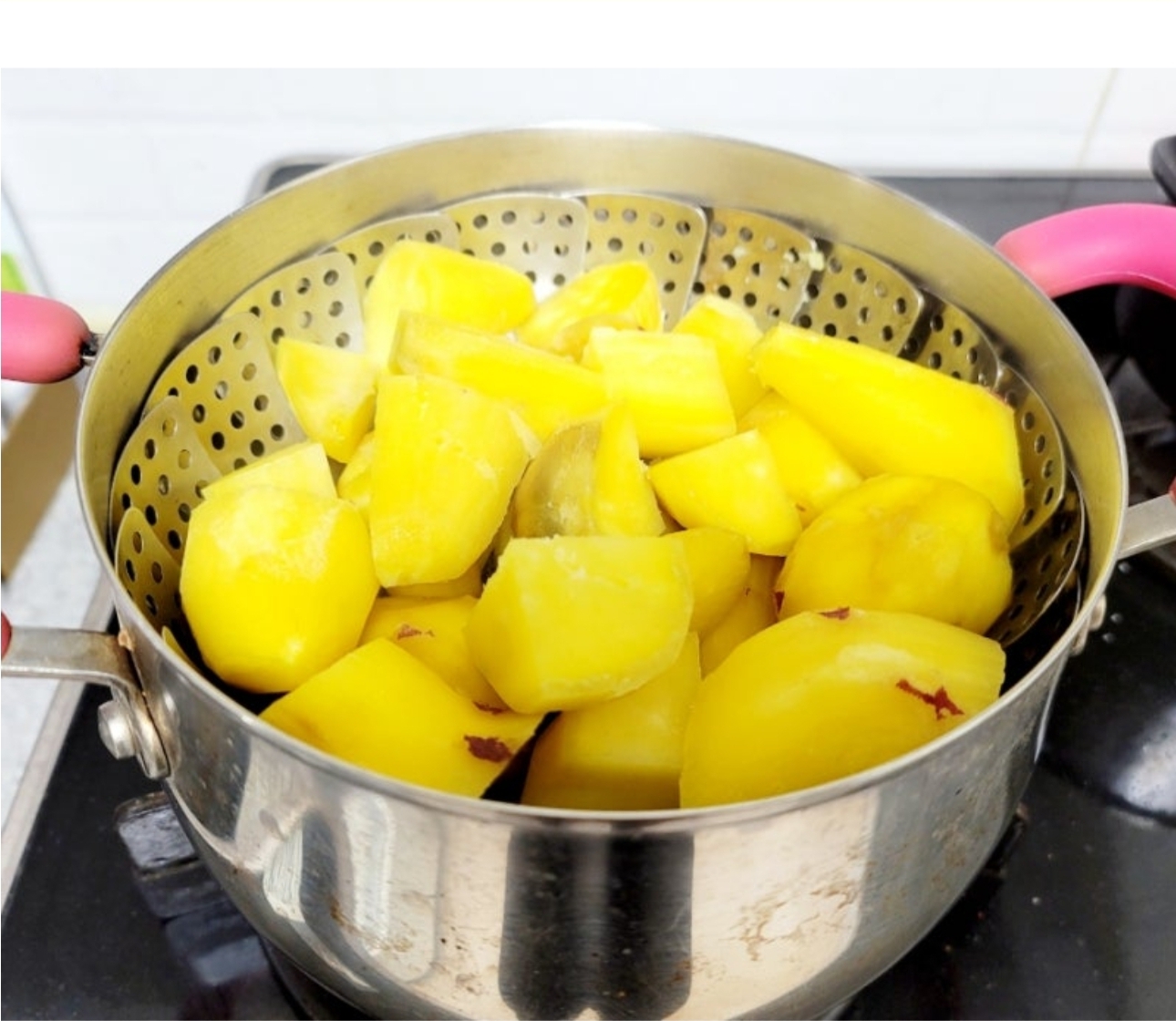 냄비에 찜기를 올리고, 이렇게 고구마를 쪄줍니다. 색깔이 노릇하니,