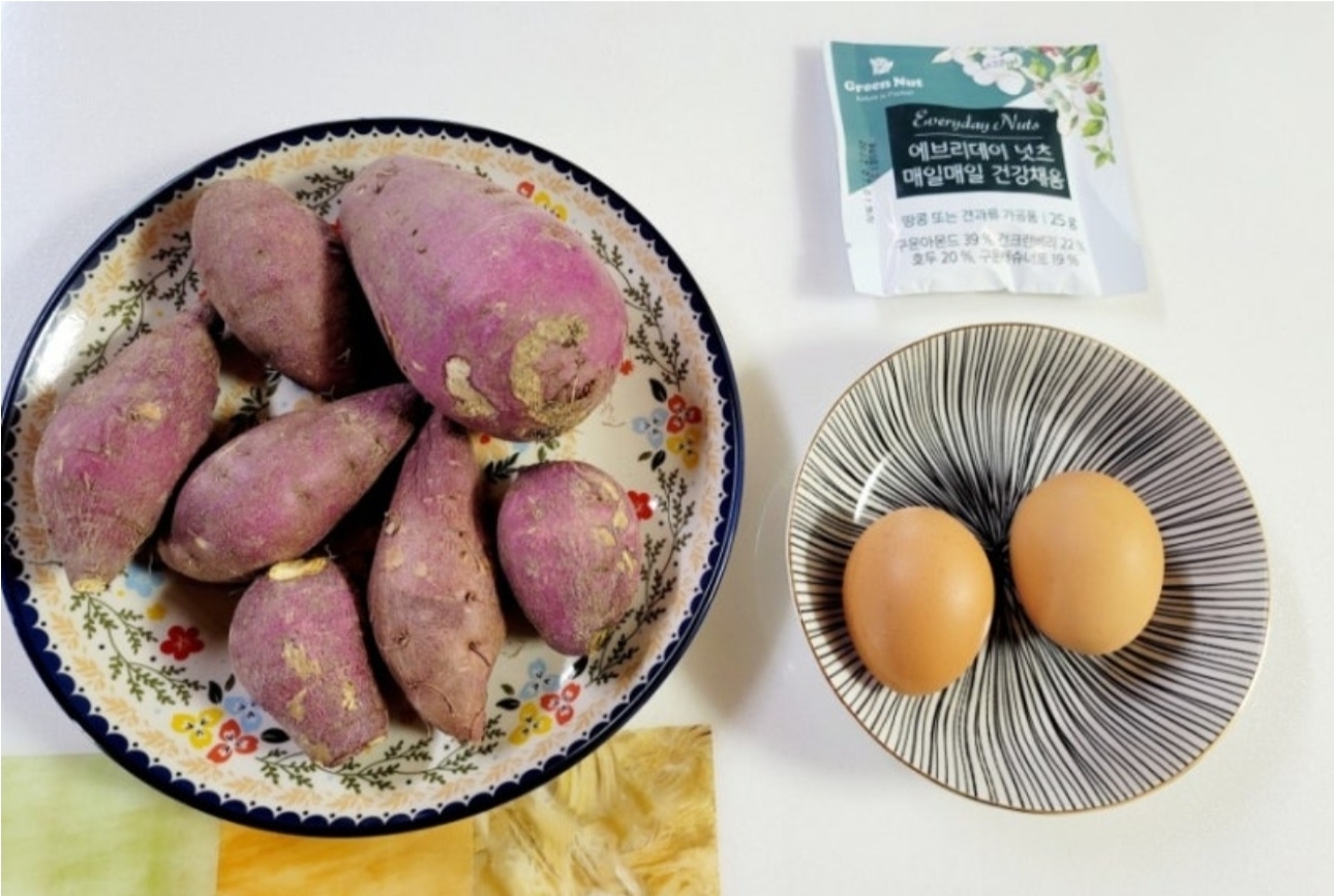 고구마 3개, 달걀 2개, 견과류 한 봉지 (선택사항입니다만, 넣으면 맛이 훨씬 좋아져요!)