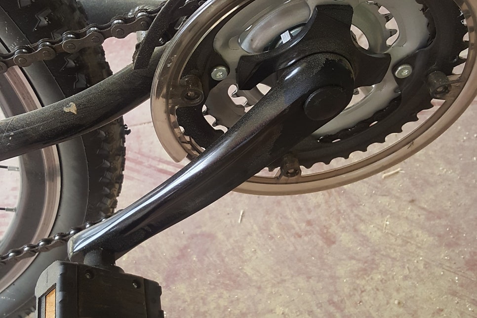 이 부분을 풀면, 자전거의 몸체를 반으로 접을 수 있다. 처음에는 고리를 펴는 것이 쉽지 않았지만 몇 번 반복을 하면 손 쉽게 자전거를 반으로 접을 수 있다.