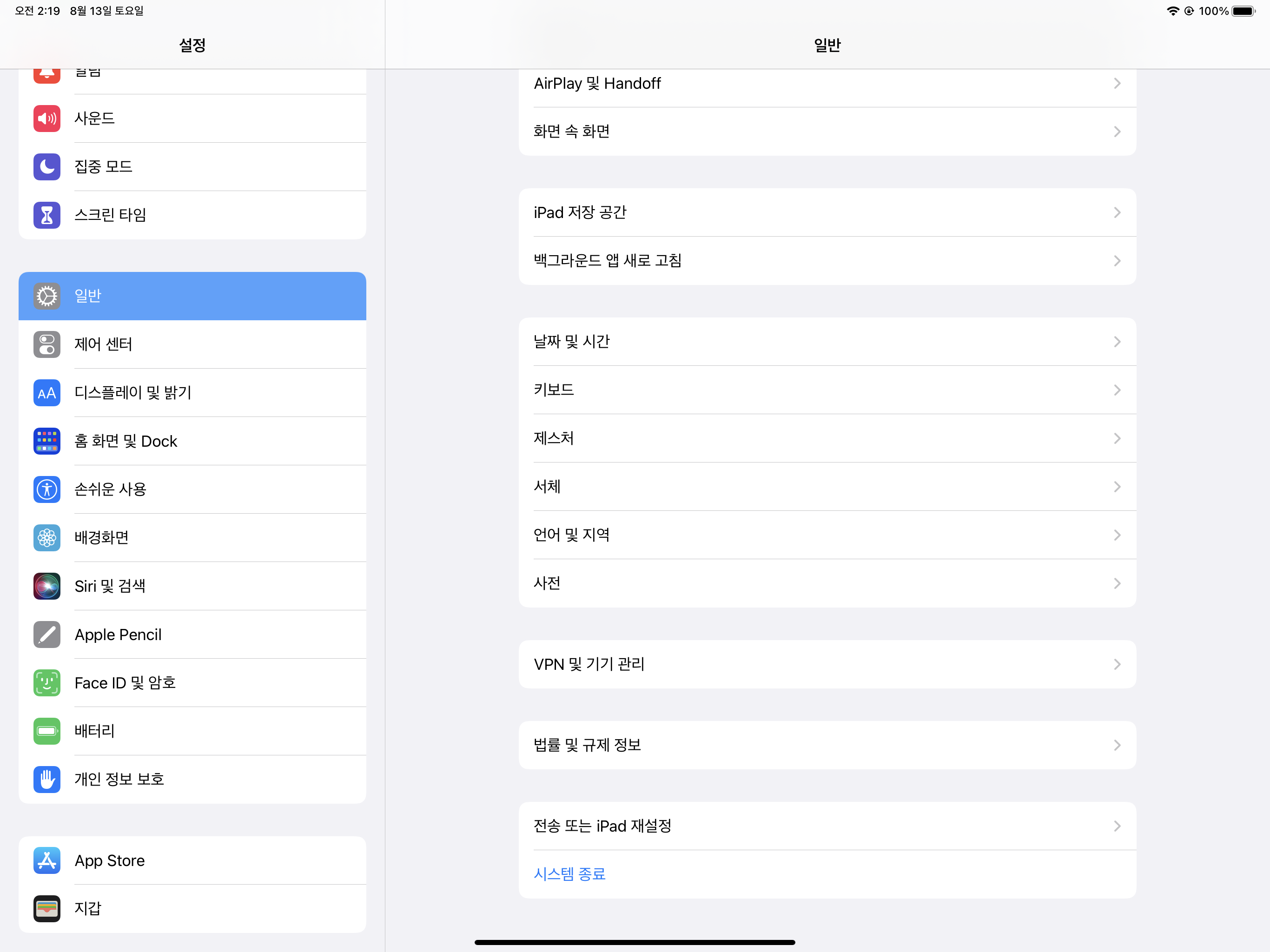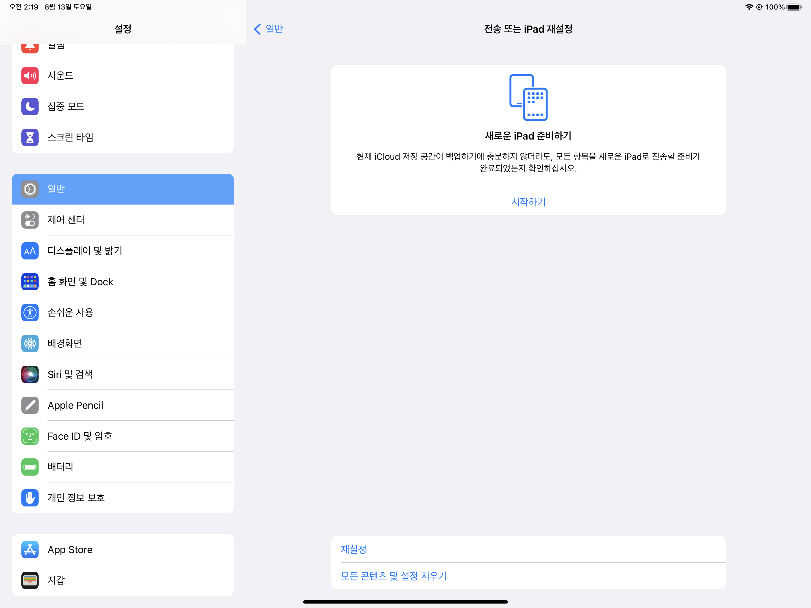 애플 A/S직원은 아이패드 12.9인치를 살펴보더니 설정으로 들어가서 일반 - 모든콘덴츠 및 설정 지우기를 해보라고 했다.