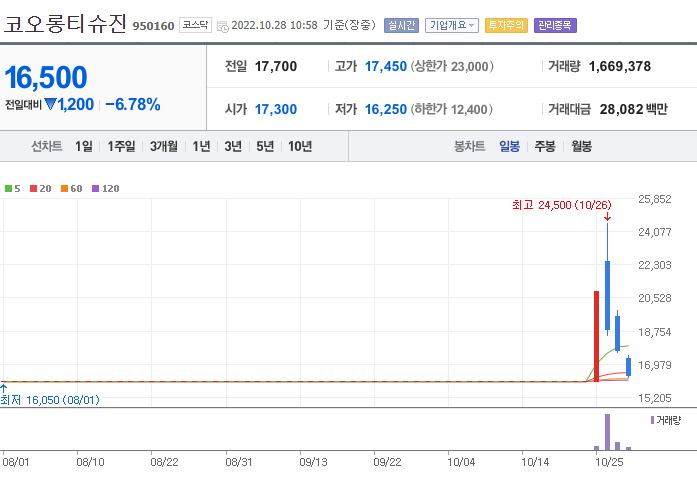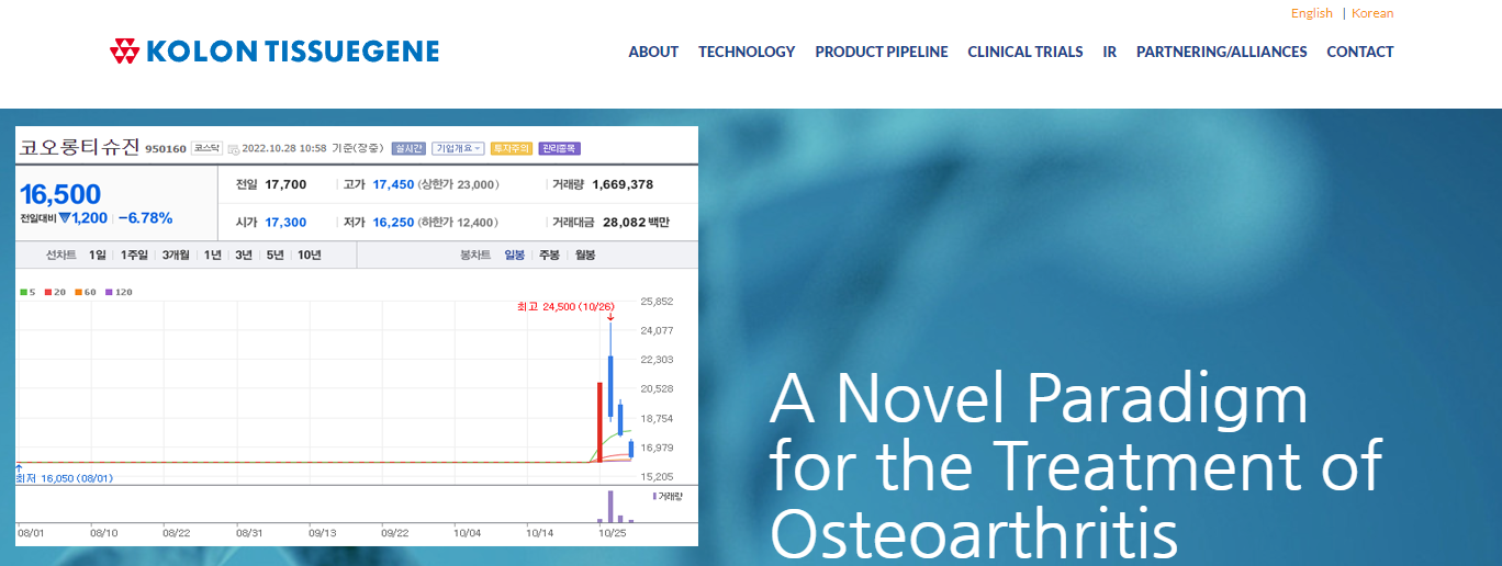 그러나 첫 날 상한가와 둘째 날 상승을 하는듯 하다가, 2틀 연속 하락세를 기록하여 10월 18일 기준 15,500원으로 종가를 마감했다. 코오롱 티슈진은 퇴행성 질환과 정형외과 질환에 관한 통증을 경감시킬 수 있는 치료법을 연구개발하는 바이오 회사이며 코오롱 그룹에서 1999년에 설립한 생명공학 R & D 회사로서 미국에 본사가 있다.