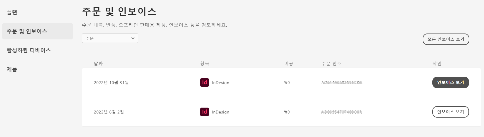 정기플랜으로 결제된 카드 정보는 어도브 홈페이지의 나의 계정으로 들어가서, 플랜관리 페이지에서 취소를 하면 카드 결제가 된 부분을 환불 받을 수 있으면 처리 기간은 5-6일 정도 소요된다고 한다. 자세한 취소 정보는 인보이스(송장)를 클릭해서 보면 내역이 나온다.