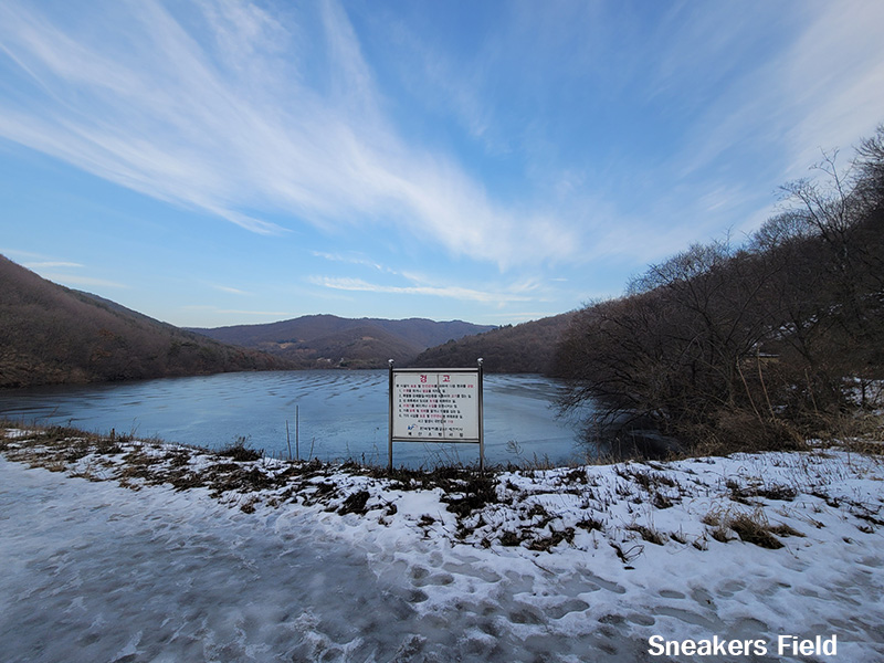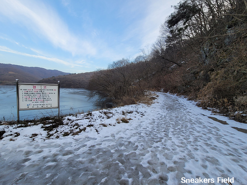 저수지의 입구 쪽에는 경고 문구가 씌여져있습니다. 수영을 하거나 물놀이를 하지 말라는 내용등 경고 문구들이 으스스한 분위기를 조성해주기도 합니다. 이곳에서 낚시를 하던 낚시꾼들은 밤 10시 이후에는 모두 돌아갈 정도로 밤이되면 압도적으로 음산하고 흉흉한 분위기를 자아내는 살목지. 저처럼 호러물과 공포물, 공포성지에 관심이 많은 사람들이 많은 발걸음을 했을 법합니다. (제가 찾아갔을때에는 빙판길이 너무 미끄러워서 주변을 세세히 둘러보지는 못했습니다.)
